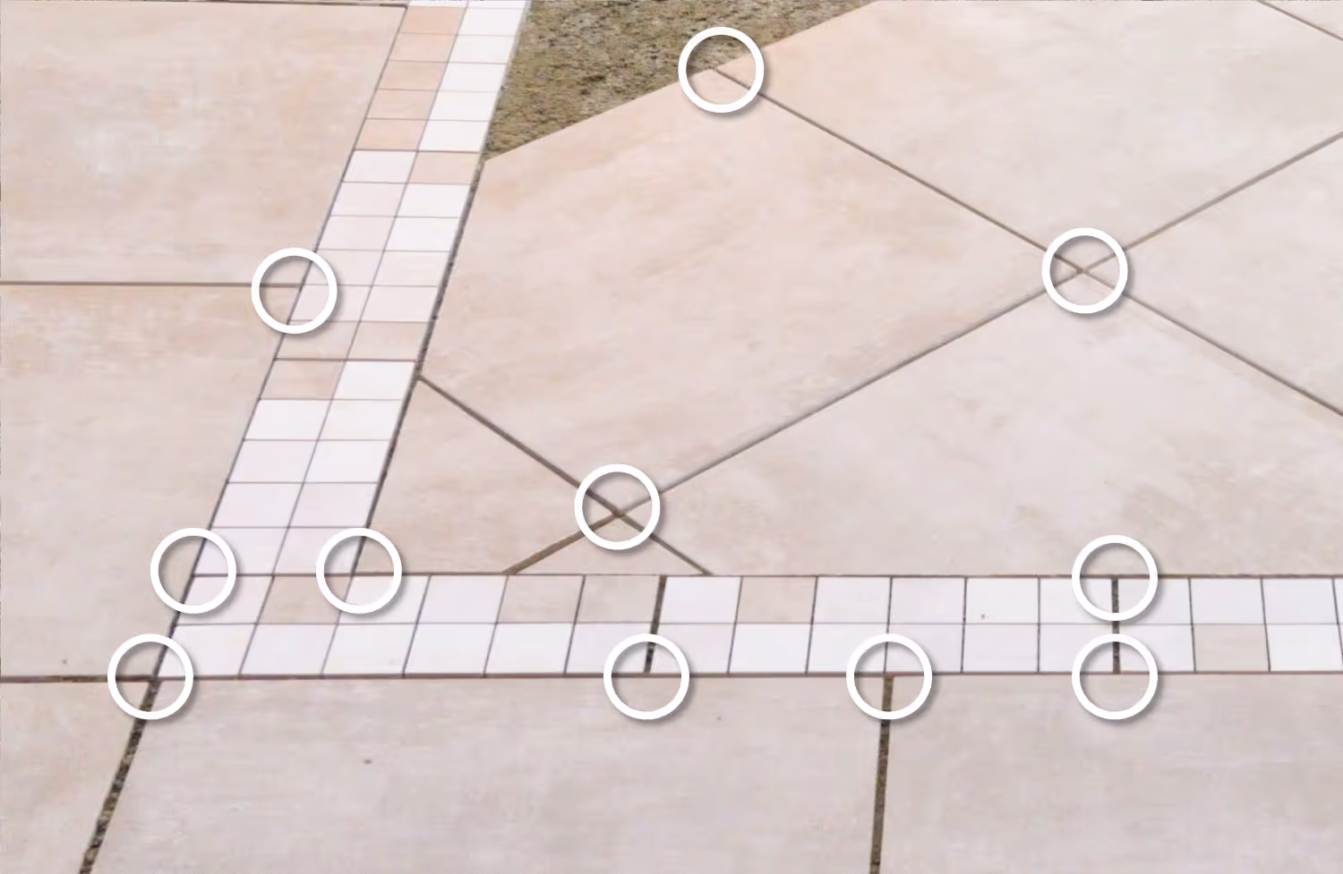 5-Punkt-Verlegung bedeutet, dass die Terrassenplatten an 5 Punkten auf Plattenlagern aufliegen. In der Regel ist immer ein Viertel eines Plattenlagers je Ecke verbaut und in der Mitte der Terrassenplatte wird ein weiteres ganzes Plattenlager ohne Fugensteg untergelegt. Dieses Vorgehen wird empfohlen, sobald eine Plattenseite länger als 60 cm ist.